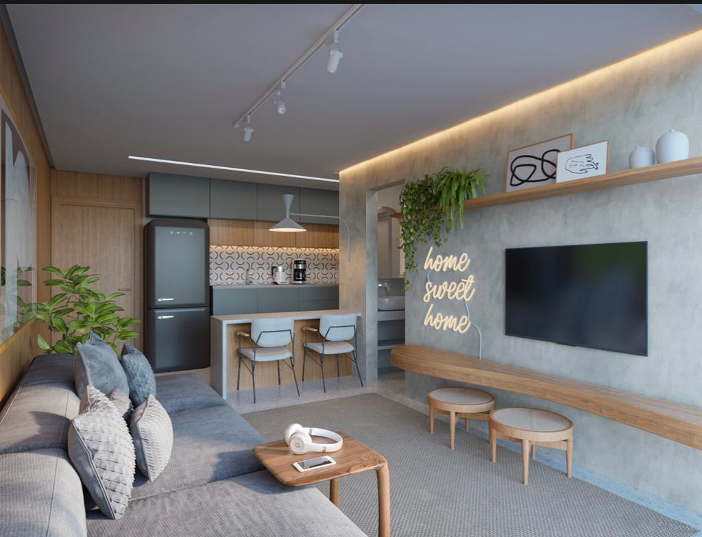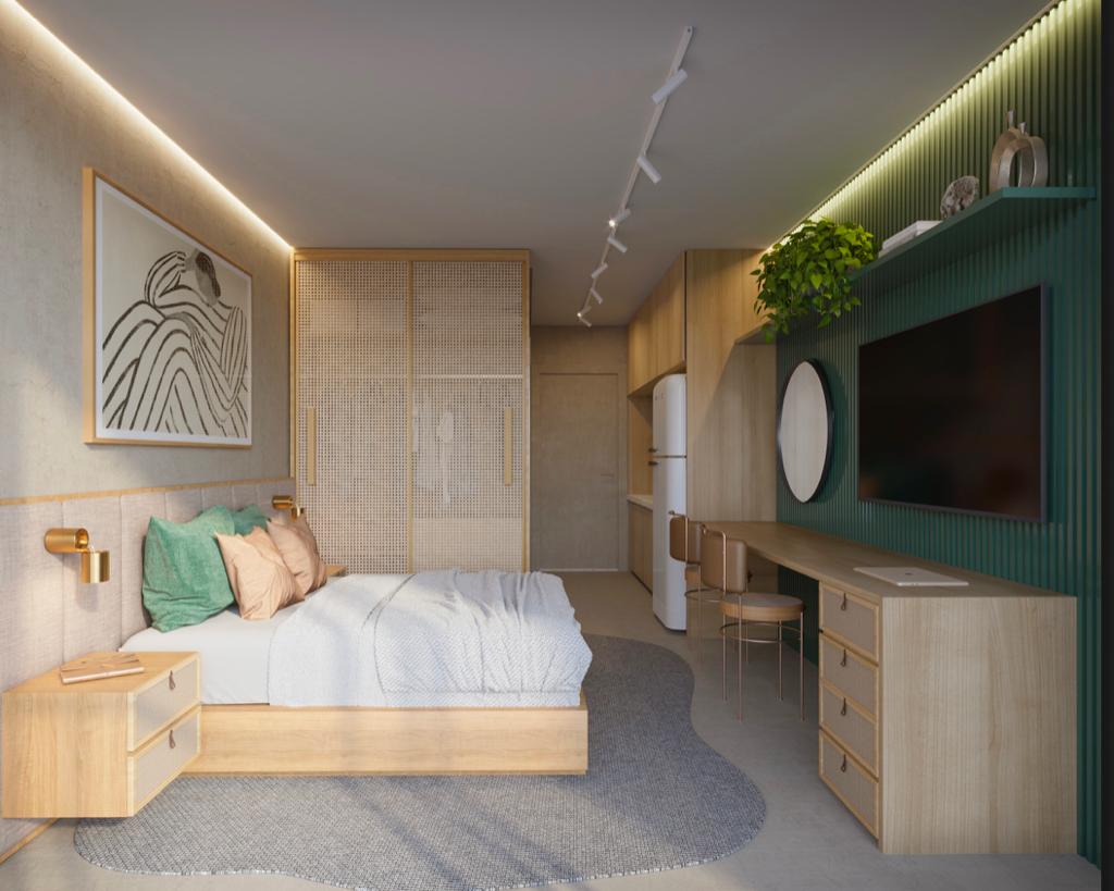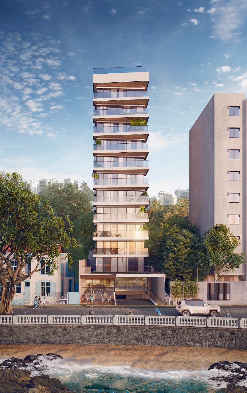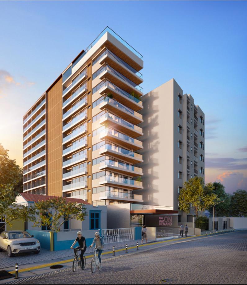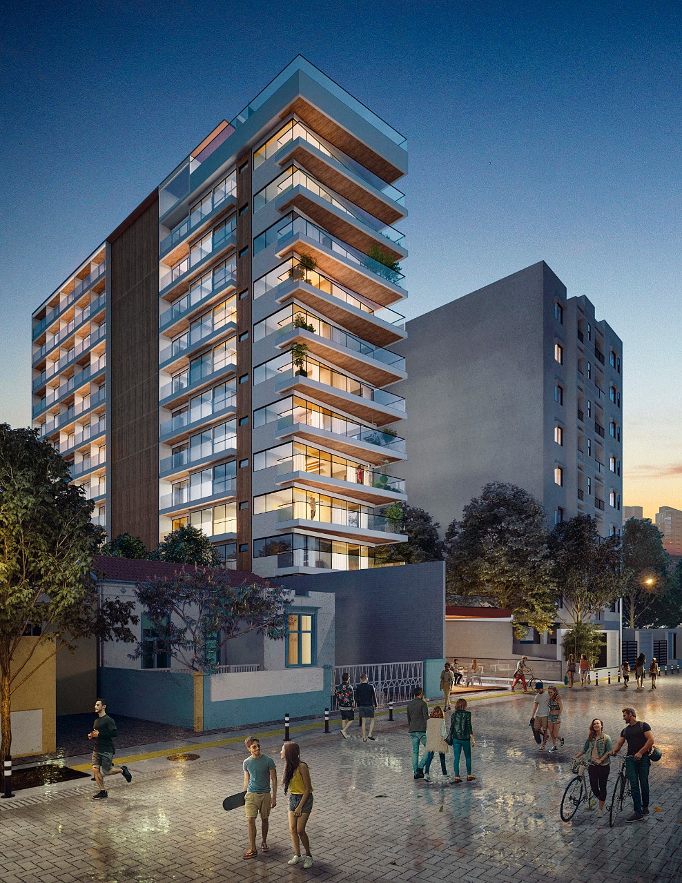 Este edifício residencial contemporâneo de múltiplos pavimentos exibe uma fachada sofisticada, marcada por linhas retas, amplos terraços envidraçados e detalhes em madeira que realçam sua elegância. O projeto harmoniza o moderno e o aconchegante, integrando-se perfeitamente ao contexto urbano onde uma charmosa casa térrea preservada se destaca ao lado. A ambientação reflete um estilo de vida urbano refinado, com ciclistas circulando pelas ruas, vegetação exuberante e um pôr do sol que ressalta as texturas e os materiais utilizados, evidenciando o alto padrão e o conforto que os moradores desfrutarão.